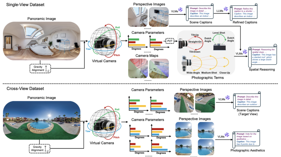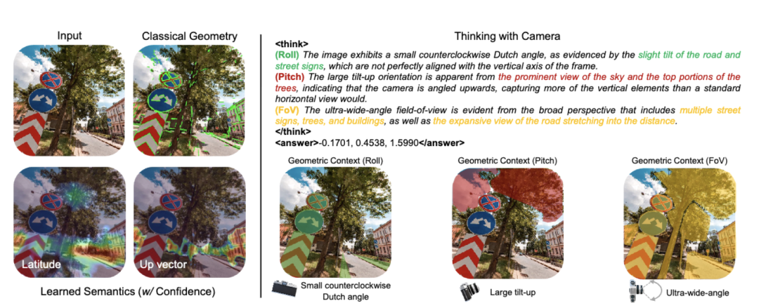 三维世界受物理规律支配,重力与人工设计共同塑造了稳定的结构分布,为空间感知提供了强有力的先验。例如,天空、天花板、地面、沙滩等少纹理区域虽缺乏视觉特征,却蕴含着垂直方向的规律性,对俯仰角(pitch)估计至关重要。同样,视场角(FoV)的估计依赖于对空间构图的感知,包括前后景比例、物体尺度与深度分布等。虽然这些属性难以从纯视觉表征中直接推断,但多模态大模型已将其隐式地编码为知识先验。因此,团队将这些具备空间约束的视觉线索嵌入训练过程使用的“思维标签”(thinking captions)中,使模型能够对相机几何进行显式的空间推理。