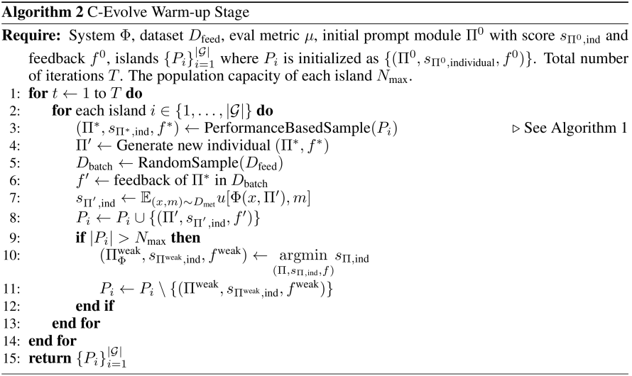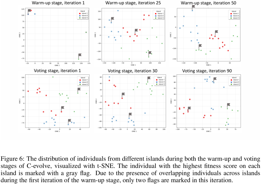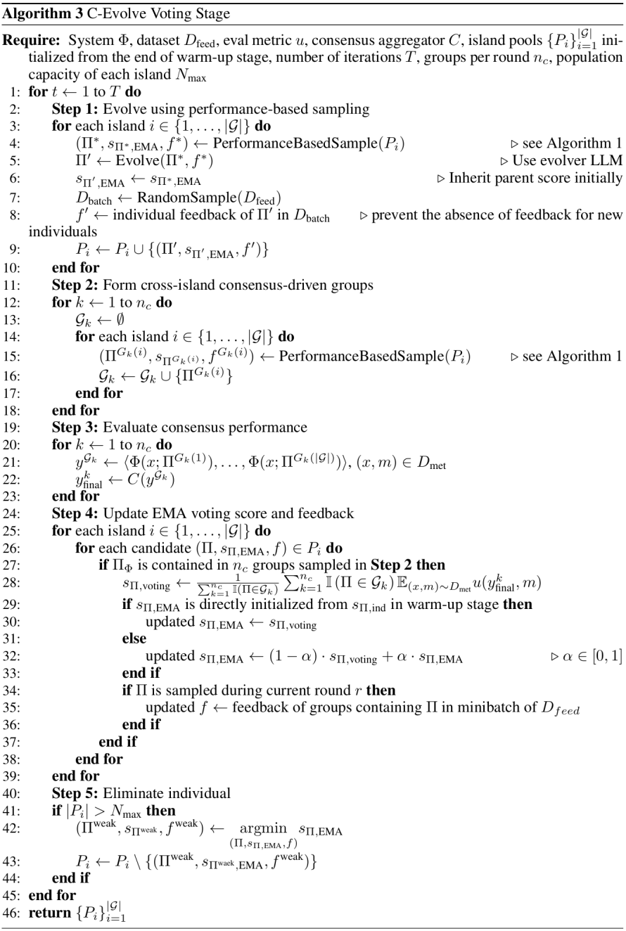 为实现这一目标,团队创新性地提出了「共识表决得分」这一进化指标,用于评估单个提示词在成组工作时的性能潜力,同时采用海岛算法提升组内个体的多样性。