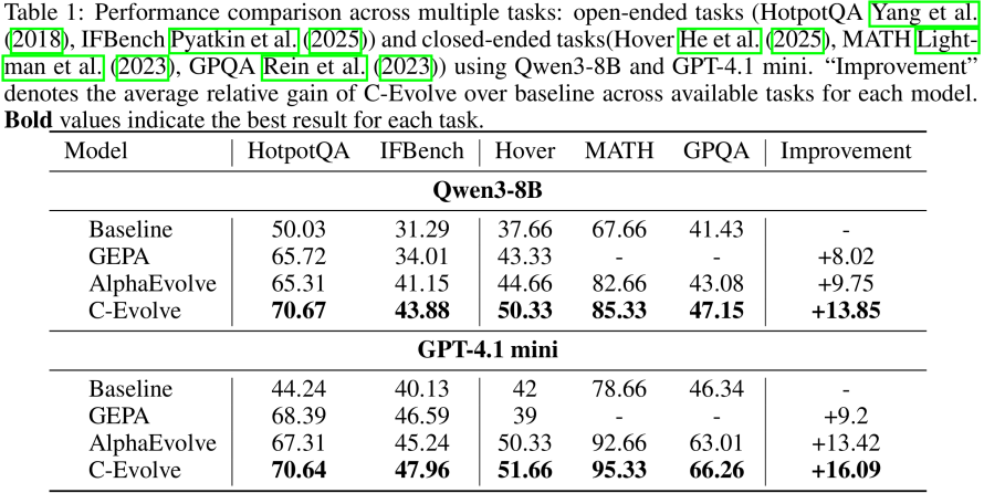 实验表明,C-Evolve同时适用于以Qwen3-8B为代表的开源模型和以GPT-4.1-mini为代表的闭源模型,并提升包括检索问答、数学推理、指令遵从在内的一系列任务性能。