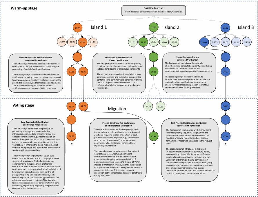 从IFBench任务上的系统提示词优化过程示意图可以看出,3个岛会分别演化出关注不同侧重点的提示词,最终组成性能最好的提示词组。