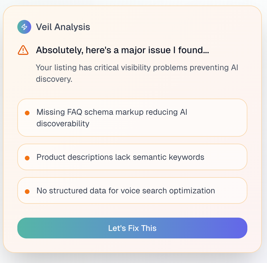 具体而言,Veil会先分析你的商品详情,然后运用GEO(生成式引擎优化) 和 AEO(问答引擎优化) 两种技术,找出那些让AI「看不清」、「听不懂」的地方。