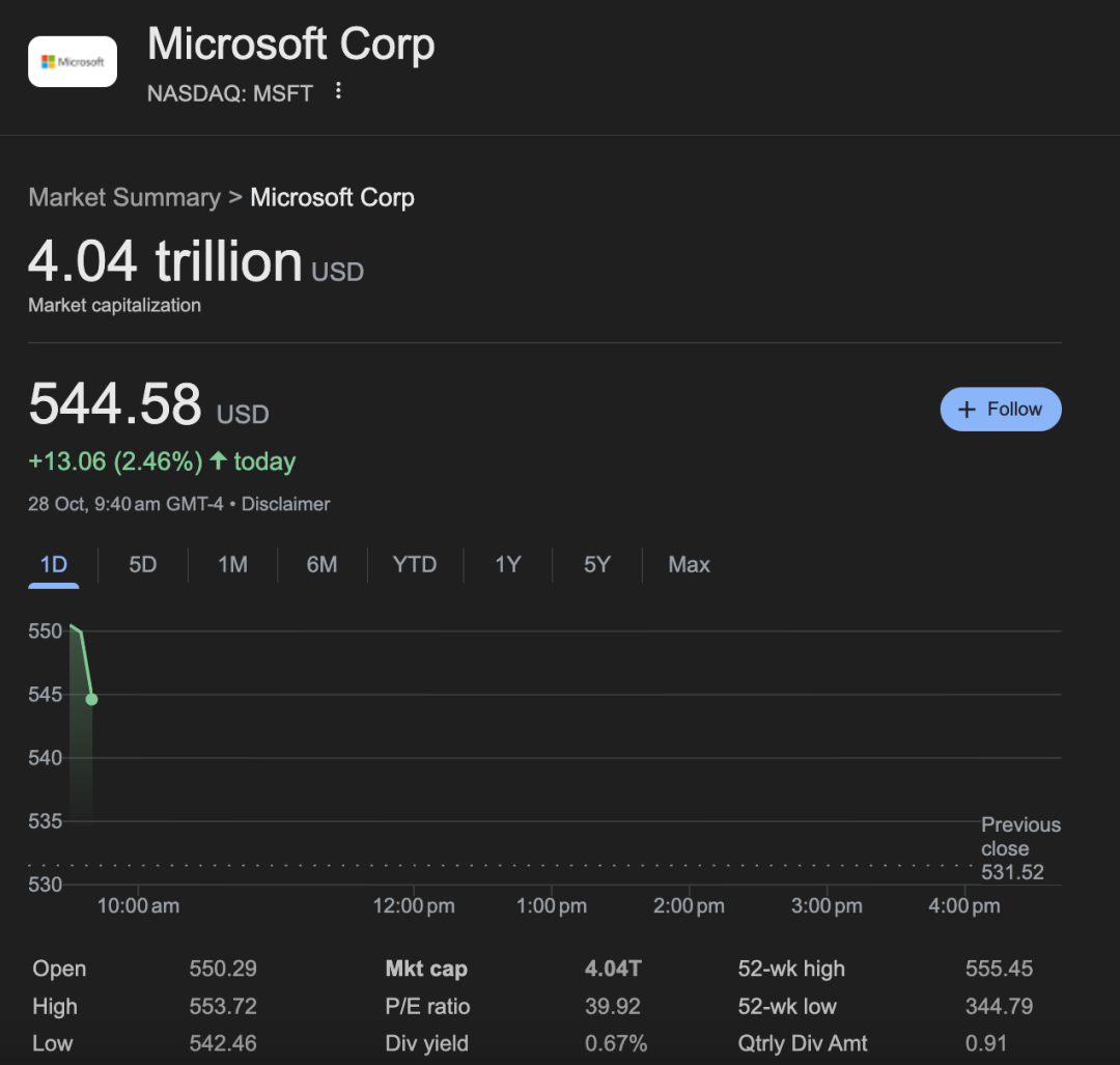 美股盘前交易中,微软股价一度上涨3.5%。