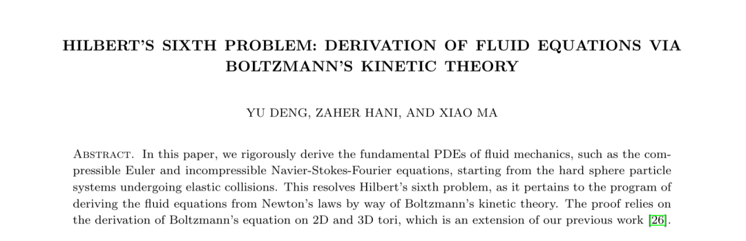 该问题是David Hilbert在1900年提出的23个数学难题之一,其中比较广为人知的包括黎曼猜想、哥德巴赫猜想等,第六题则要求学者从牛顿力学出发,通过玻尔兹曼动力学理论,推导出流体力学中的基本方程。