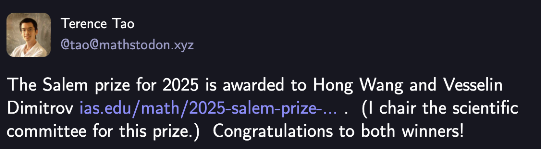 在获奖名单公布之后,陶哲轩也是第一时间发文恭喜。