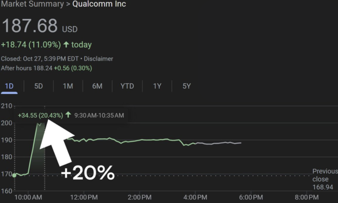 消息一出,高通股价一度飙升超20%,创自2019年以来的最大单日涨幅。