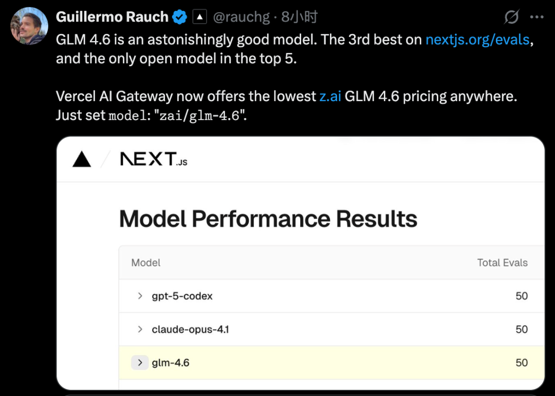 GLM-4.6很好,在http://nextjs.org/evals上排名第三,还是前五名里唯一开源的模型。