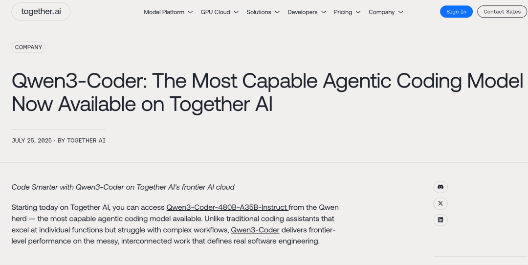 以及更早的,像美国云服务平台Together AI也是在今年7月份官宣部署Qwen-3-Coder: