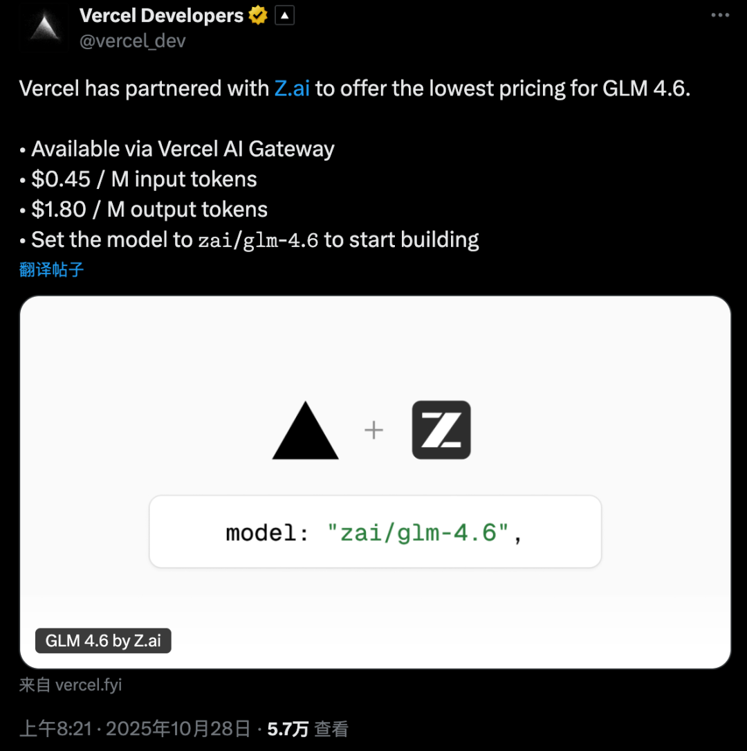 已经和智谱达成合作,提供GLM-4.6的API服务。
