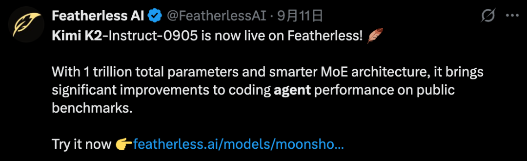 更早一点的,无服务器AI推理平台Featherless,此前在Kimi K2发布之际,也表示支持其新模型: