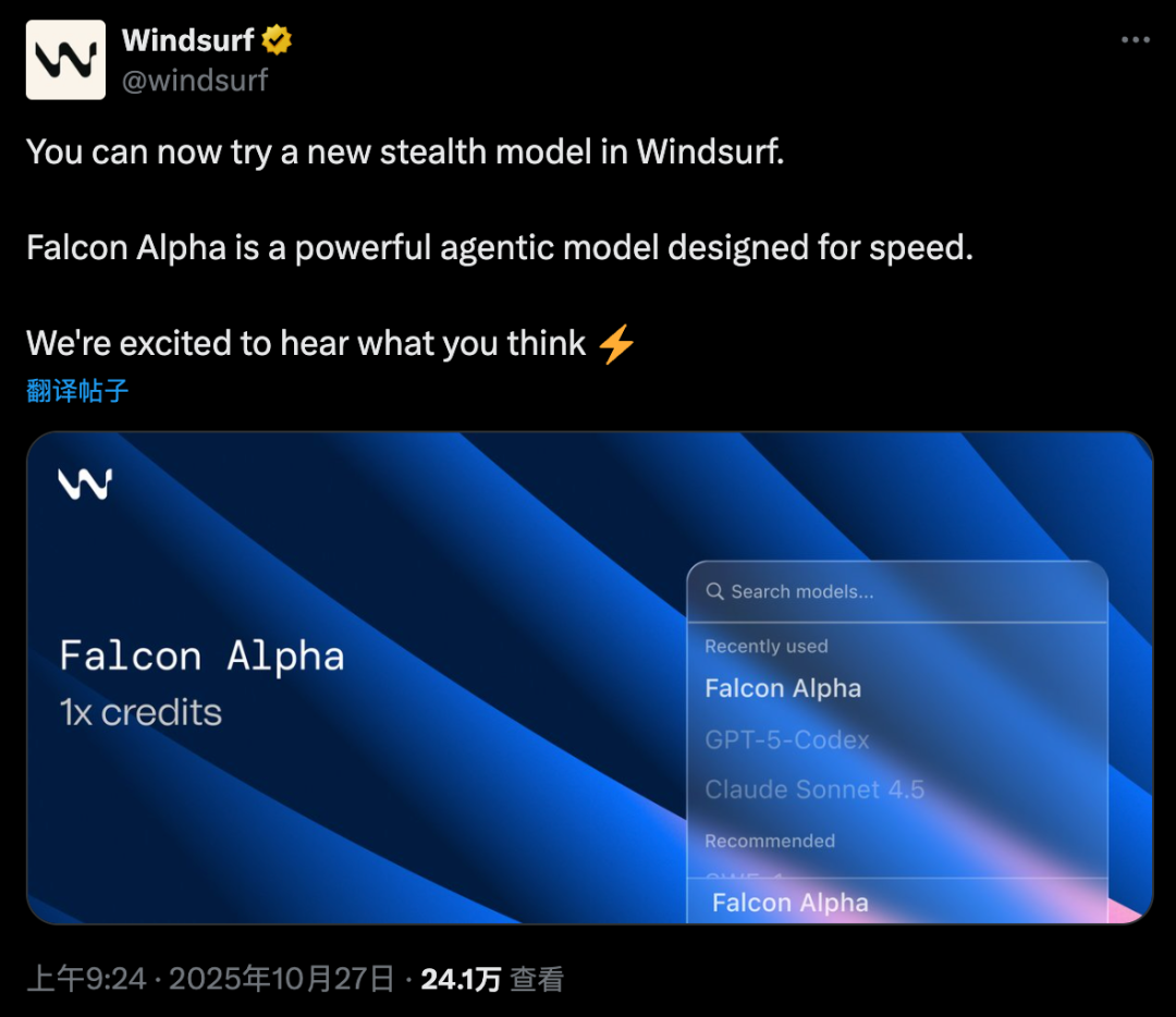 起因是它这两天在自家产品里上新了一个神秘模型,说是专门为了速度和Agentic而设计的模型: