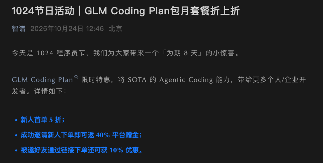 智谱在1024程序员节当天推出GLM Coding Plan包月套餐折上折的活动,新人更是5折优惠