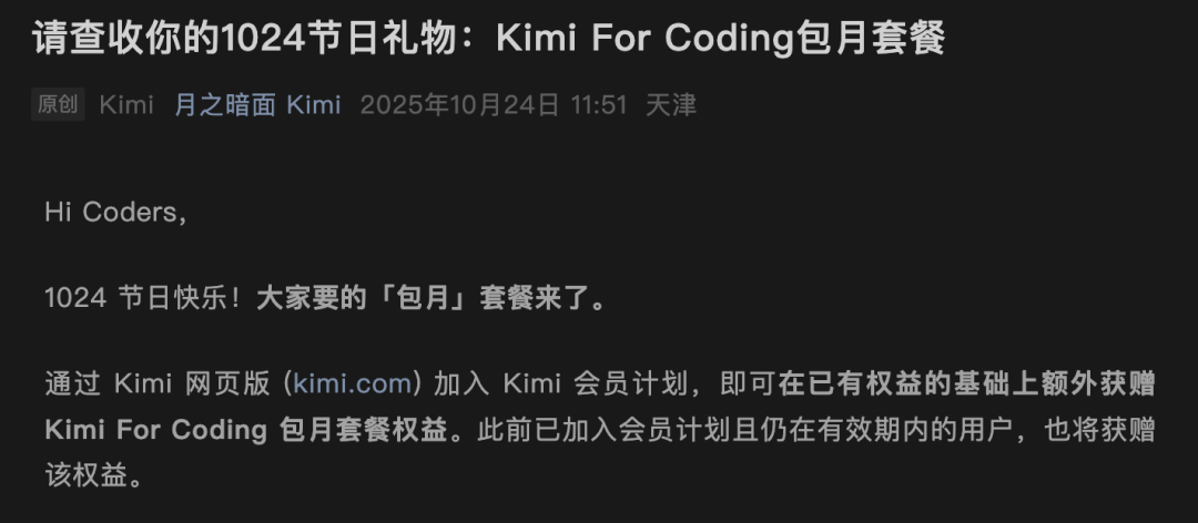 Kimi也在程序员节当天也推出了类似的针对程序员的优惠套餐