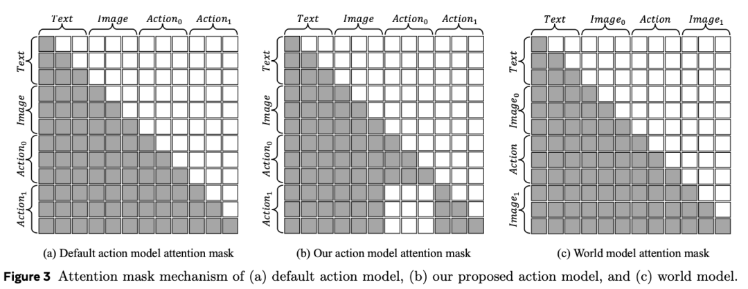 这种设计使自回归框架能够并行生成多个动作,世界模型部分则仍遵循传统的因果注意力掩码,如上图(c) 所示。