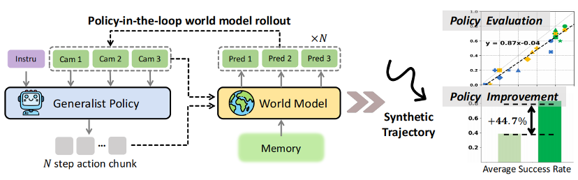 注:Ctrl-World专为通用机器人策略的策略在环轨迹推演而设计。它生成联合多视角预测(包括腕部视角),通过帧级条件控制实现细粒度动作控制,并通过姿态条件记忆检索维持连贯的长时程动态。这些组件实现了:(1)在想象中进行精准的策略评估,并与真实世界轨迹推演对齐(2)通过合成轨迹实现针对性的策略改进