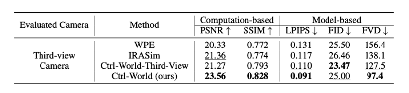 而CTRL-WORLD创新性地联合生成第三方全局视角+腕部第一视角: