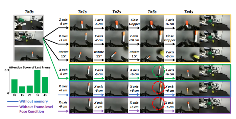 注:上图展示的是Ctrl-World的可控性及其消融实验。不同的动作序列可以在Ctrl-World中以厘米级的精度产生不同的展开结果。移除记忆会导致预测模糊(蓝色),而移除帧级姿势条件会降低控制精度(紫色)。注意力可视化(左侧)在预测(t=4)秒帧时,对具有相同姿势的(t=0)秒帧显示出强烈的注意力,说明了记忆检索的有效性。为了清晰起见,每个动作块都用自然语言表达(例如,“Z轴-6厘米”)。由于空间限制,仅可视化了中间帧的腕部视角。