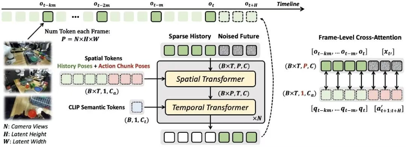 姿态锚定检索:将采样帧的机械臂姿态信息嵌入视觉token,在预测新帧时,模型会自动检索“与当前姿态相似的历史帧”,以历史状态校准当前预测,避免漂移。
