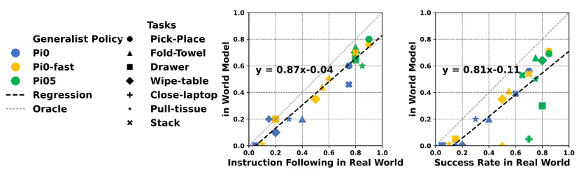 虚拟预演的“指令跟随率”与真实世界的相关系数达0.87(拟合公式y=0.87x-0.04)。