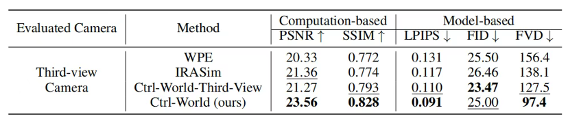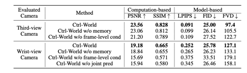 在10秒长轨迹生成测试中(256个随机剪辑,15步/秒动作输入),CTRL-WORLD在核心指标上全面领先基线模型(WPE、IRASim):