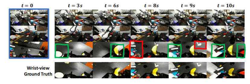 注:上图展示的是Ctrl-World的一致性。由于腕部摄像头的视野在单一轨迹中会发生显著变化,利用多视角信息和记忆检索对于生成一致的腕部视角预测至关重要。绿色框中突出显示的预测是从其他摄像头视角推断出来的,而红色框中的预测则是从记忆中检索得到的。