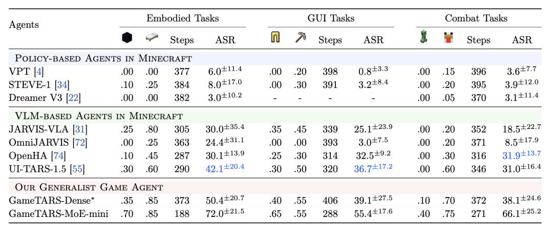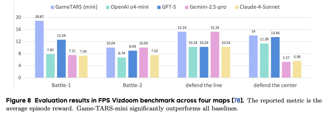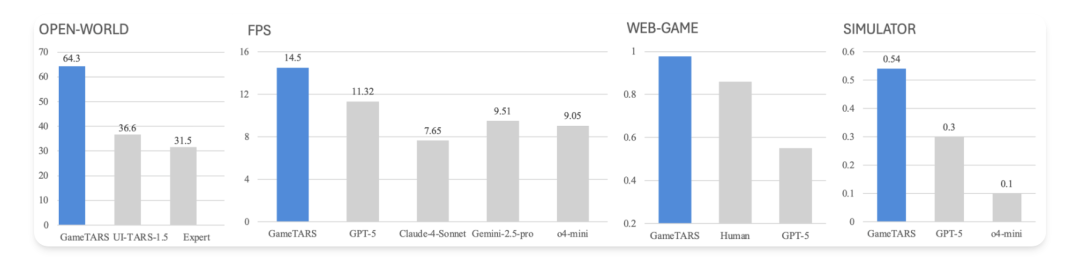 实验表明,Game-TARS 的迷你版本在各种任务上超越了著名的预训练模型,如Gemini-2.5-Pro 、GPT-5和Claude-4-Sonnet ,展示了在不同领域中的卓越性能。