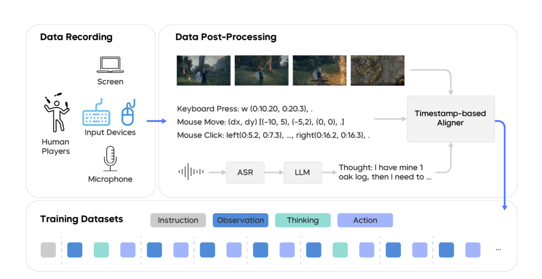 - 轨迹构建与优化:两帧间的所有键鼠操作合并为动作事件,无操作标记为no-op;推理时间戳重定位到语义相关的动作,生成高度同步、因果一致的训练序列。