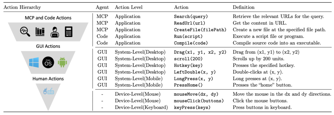 这种设计使智能体的动作指令集与任何特定应用或操作系统解耦,实现了与人类用户物理交互方式的直接对齐——