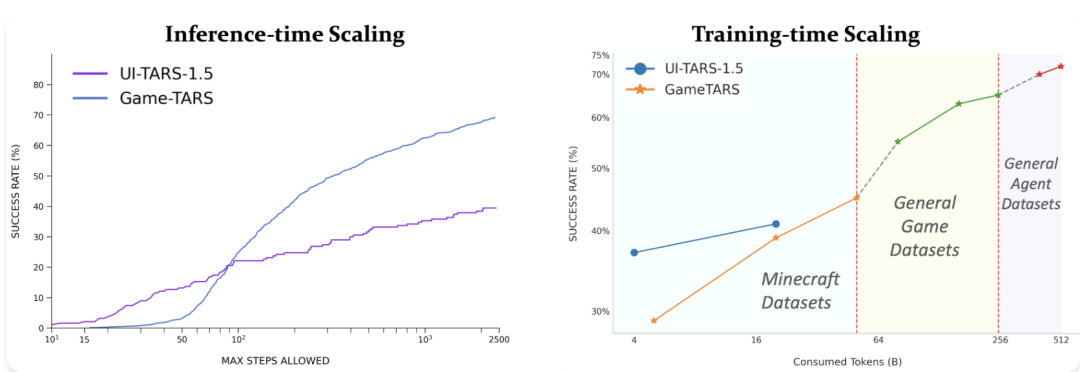 此外,实验表明Game-TARS在训练和推理过程中都具有可扩展性。