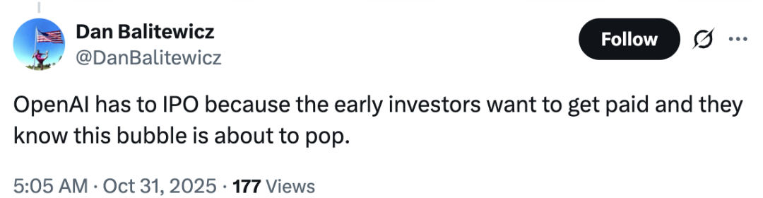 OpenAI必须尽快上市,因为早期投资者想套现离场,他们很清这个泡沫快要破了。