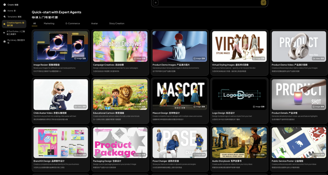 不管你是要拍广告大片、画故事书绘本,还是想改一版高质量海报,在这里都能找到对口的Agent: