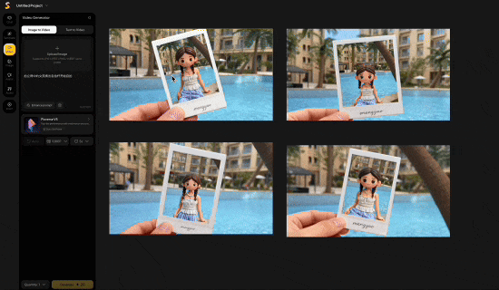 接下来进入最关键的一步:图生视频,不用切页面、不用另开工具,只要把图片拖进视频功能区,输入提示词指令,图片就能直接动起来: