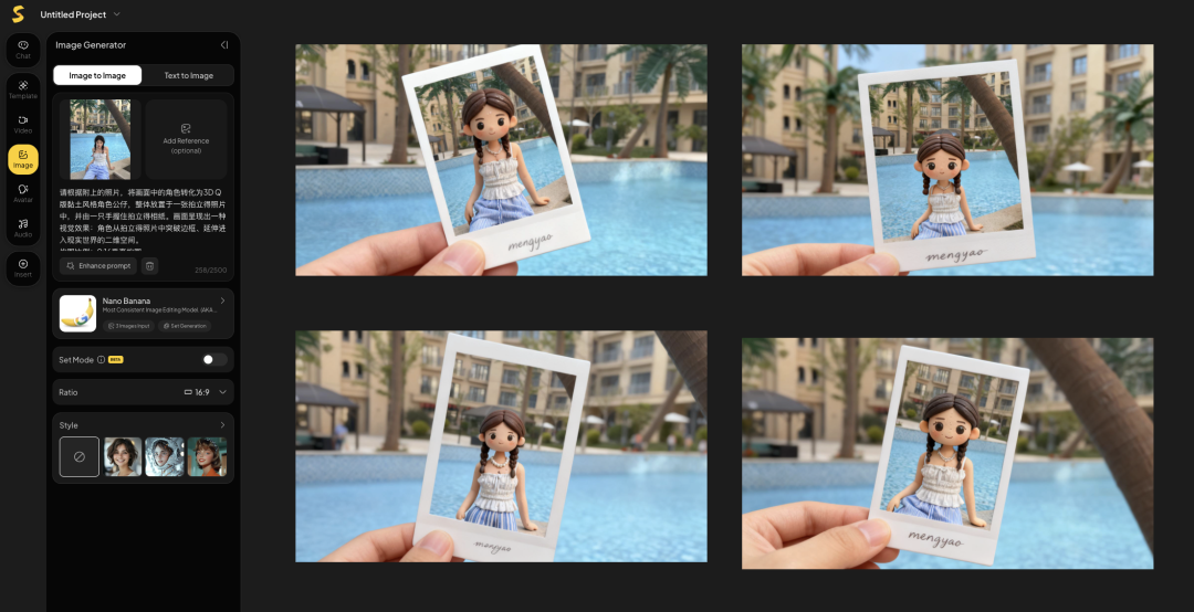 第一步,先垫个底图,输入提示词指令,用最近超级火的NanoBanana模型生个黏土风拍立得图片~