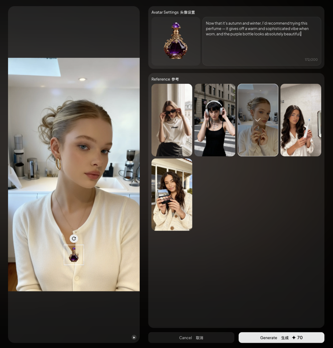 比如这个视频,我就安排数字人“手持”香水,来一段声情并茂的产品讲解,从手势到语气,专业得像随时要冲上首页带货榜: