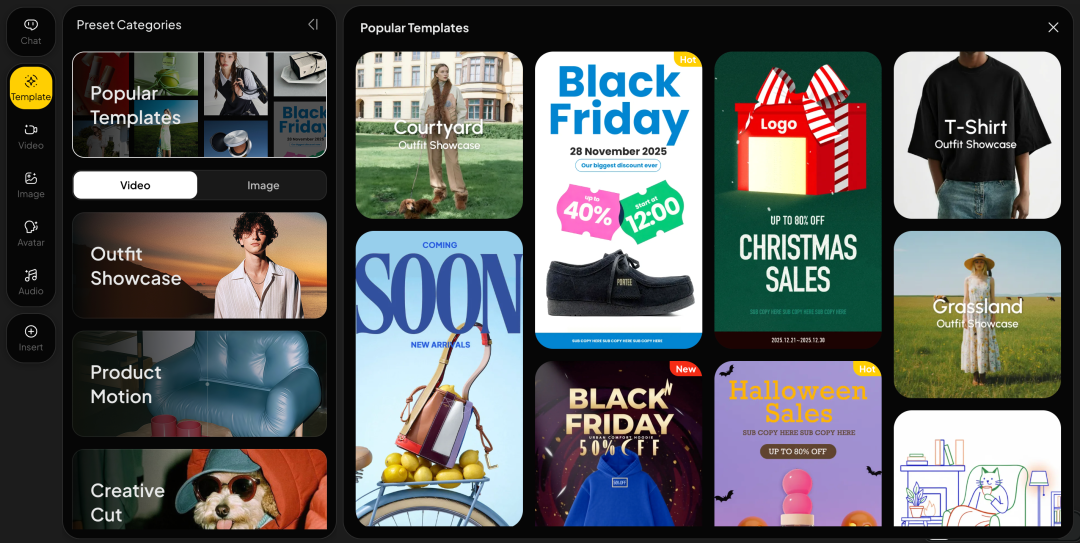 像AI数字人口播、产品功能演示、Sora那样的高阶创意广告,它都能搞定,只需要上传参考物,写点提示词,然后选个模板,就能美美坐等出片~