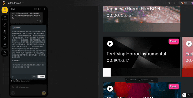 这回不喂图、不给提示词,先让AI自己整一段悬疑风格的音乐,然后我们把音乐拖进对话框中,让Agent听着节奏脑补剧情,生成一个和氛围对得上的视频。