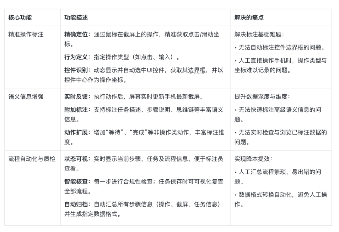 其核心价值是通过一体化标注方案,系统性解决了屏幕交互数据制作中的效率、精度与成本难题,该工具核心功能如下:
