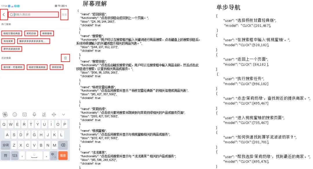基于单个GUI截图,模型需要能够像人一样对屏幕进行操作,中兴构建了几十万的单步指令数据,用来训练模型将用户指令映射到正确的UI操作上。