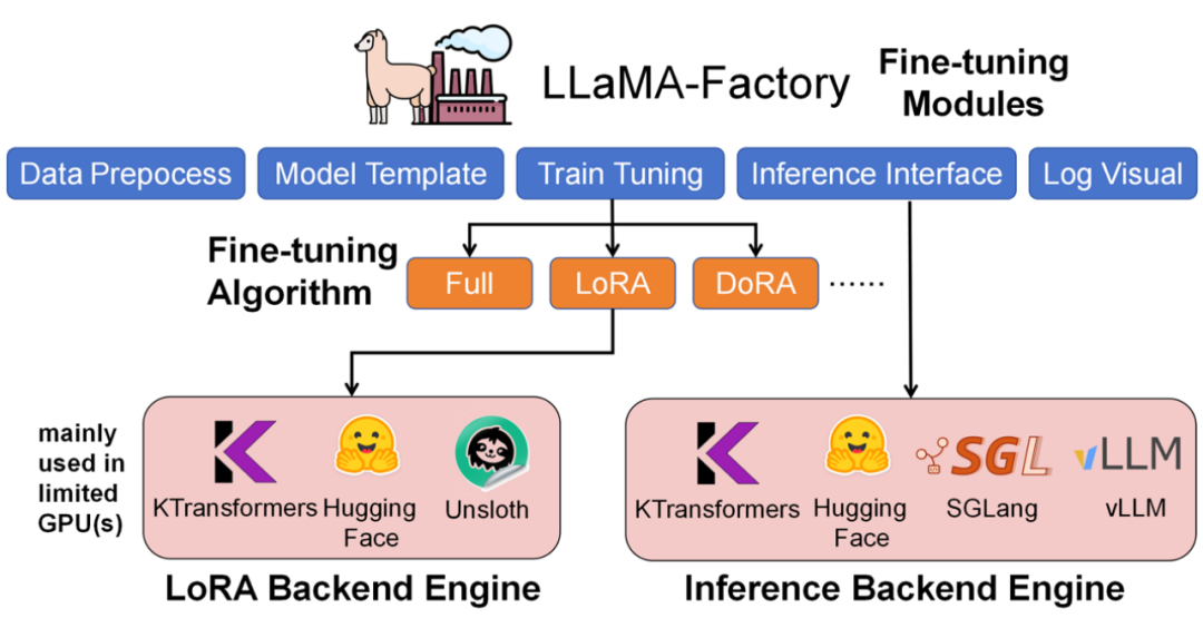 LLaMA-Factory是整个微调流程的统一调度与配置框架,负责数据处理、训练调度、LoRA(Low-Rank Adaptation)插入与推理接口管理。