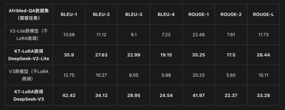 在这些具有明确风格和知识需求的任务上,经过KTransformers后端LoRA微调的模型,各项评测指标(如BLEU、ROUGE、Accuracy)均获得了大幅提升。