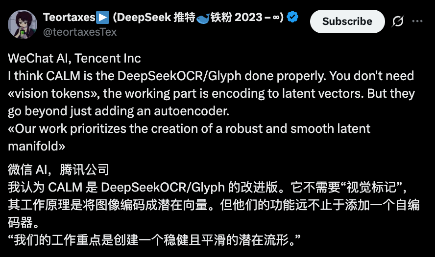 还有网友提出,CALM像是DeepSeekOCR/Glyph的改进版。