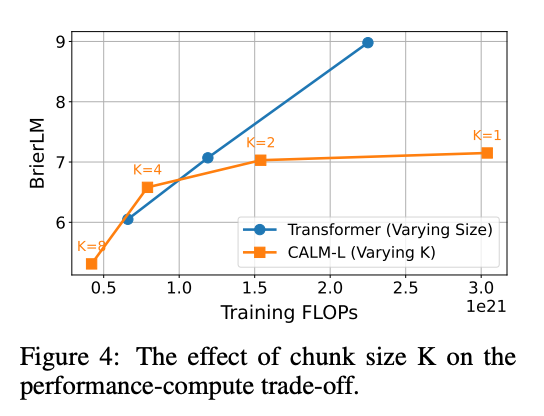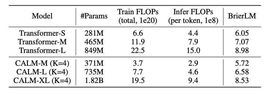 在标准语言建模任务上,CALM-M(K=4,参数量371M)在性能上与Transformer-S(281M参数)相当,但训练浮点运算数(FLOPs)减少了44%,推理FLOPs减少了34%。