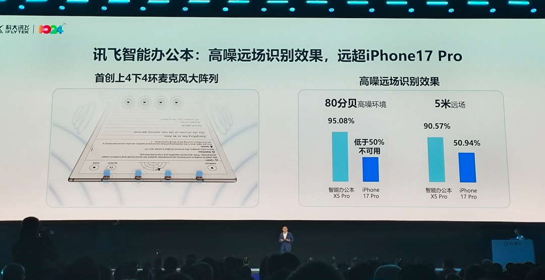讯飞智能办公本X5首创上4下4环的八麦克风阵列,能够360度声源定位,高噪远场识别效果遥遥领先iPhone 17 Pro。