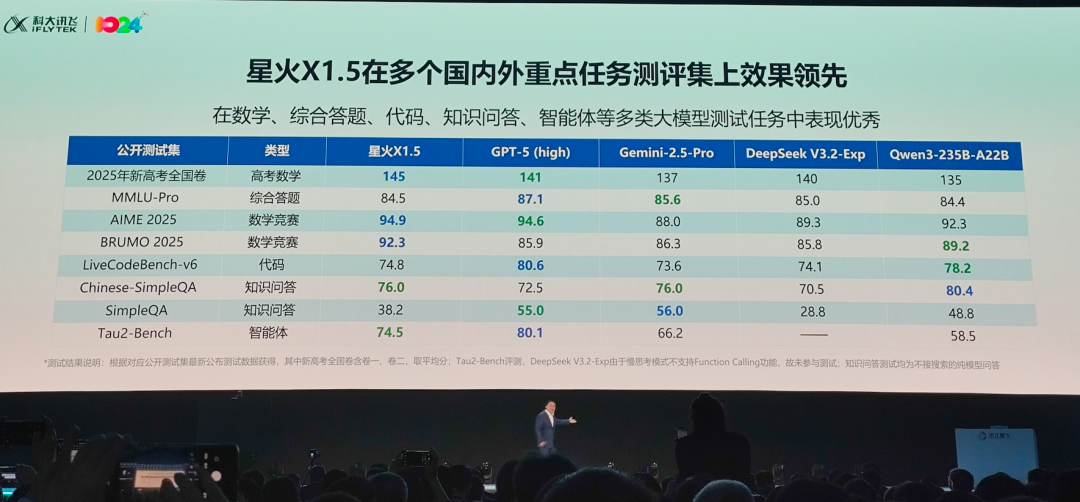 与GPT-5 (high)、Gemini-2.5-Pro D、DeepSeek V3.2-Exp、Qwen3-235B-A22B等国内外主流模型同台竞技AIME 2025数学竞赛,星火X1.5直接登顶第一。