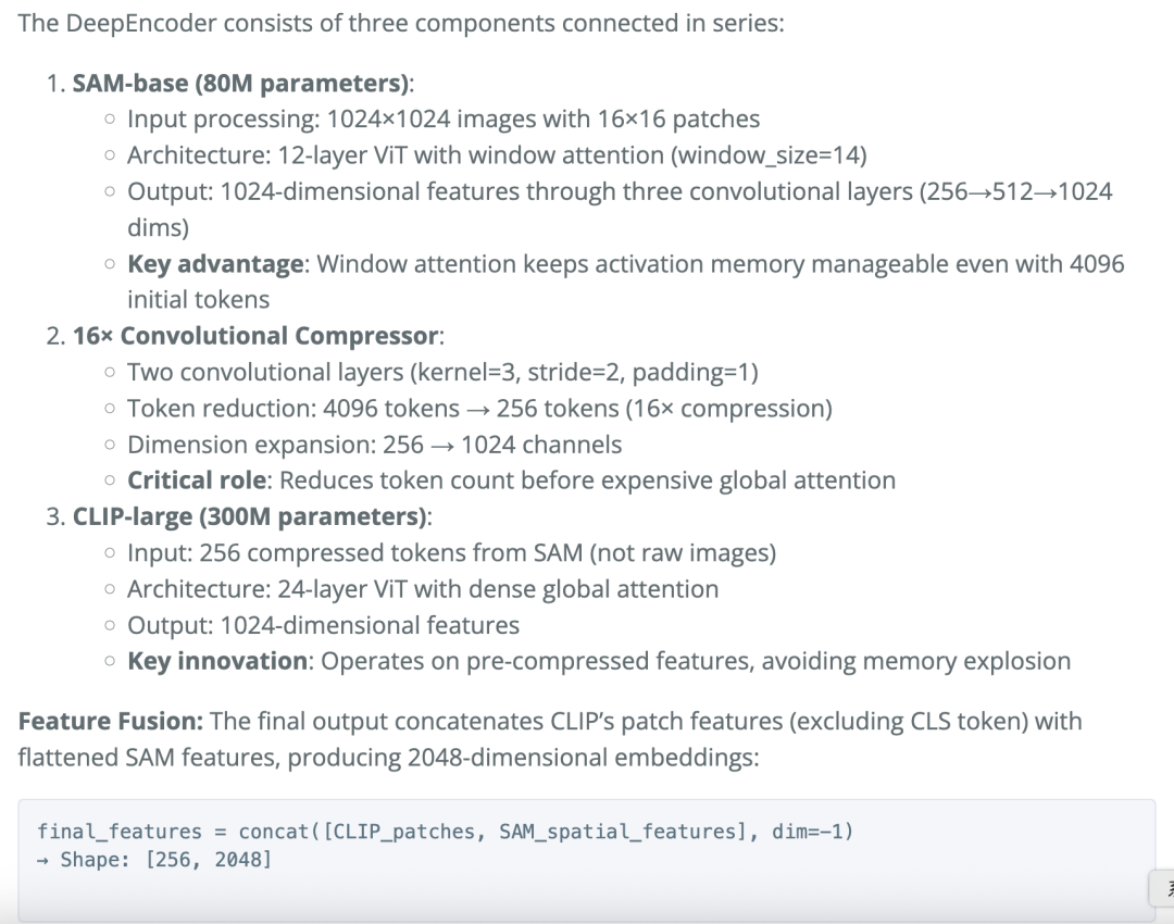 DeepSeek-OCR的灵魂就在于DeepEncoder编码器。在这部分上,团队严格遵循原版设计,采用「局部处理-压缩-全局理解」的三阶段串联结构。