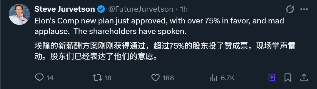 正是在刚刚召开的特斯拉年度股东大会上,这一天价薪酬方案以超过75%的票数获得通过。