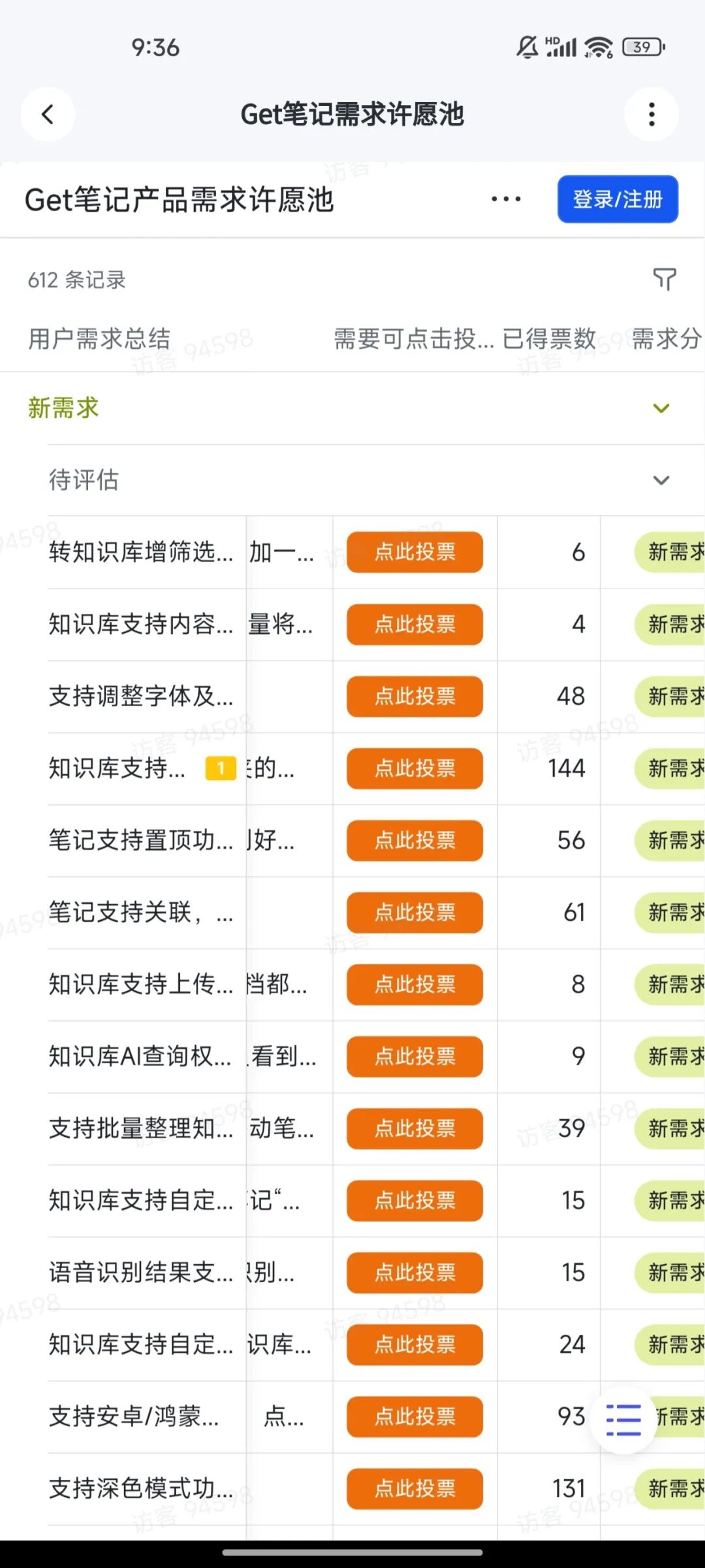3、Get笔记是和用户共创的产品,很多用户使用场景产品经理没有预想到。建立上百个用户群收集反馈并让AI分析和沉淀,但收集需求本身价值有限,更重要的是用户投票。