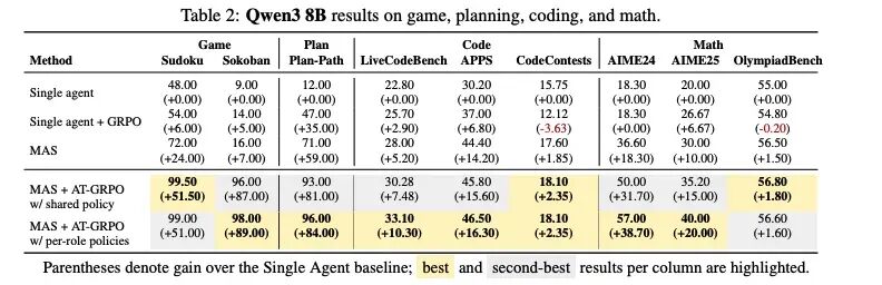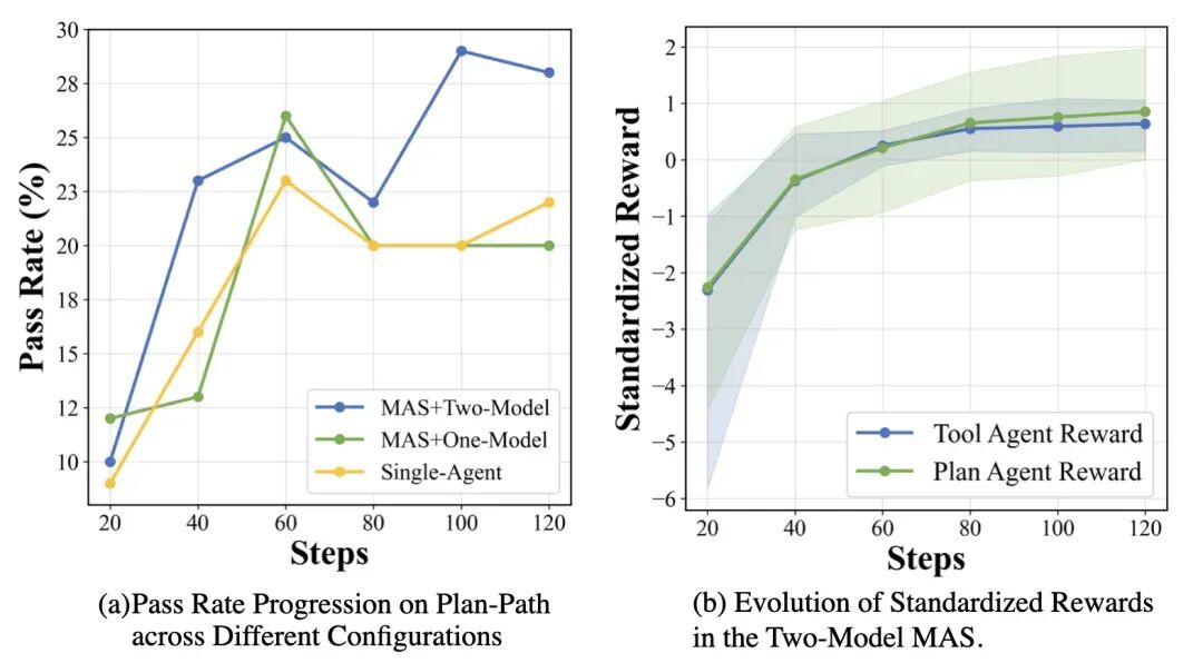 只在单智能体(SA)里训练,收益有限:把规划/工具等子角色各自放在 SA 环境里训练,单看各自指标会从 5.0% 提到11.0%/14.5%,但放回MAS联合作业仅到16.0%。