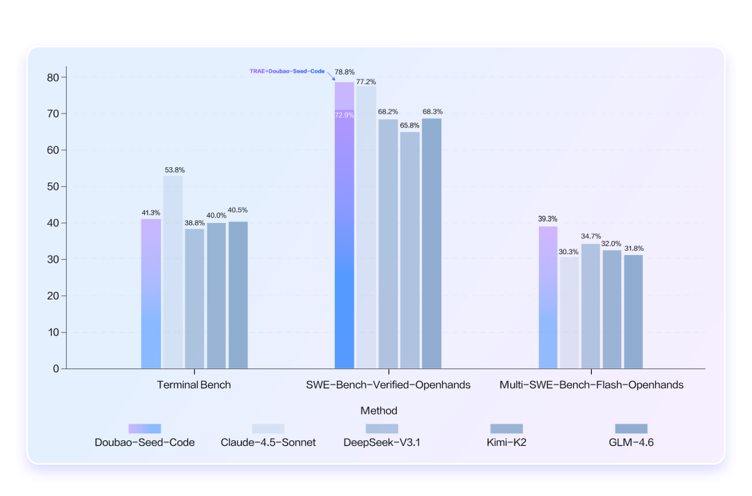 Doubao-Seed-Code在Terminal Bench、SWE-Bench-Verified-Openhands、Multi-SWE-Bench-Flash-Openhands等主流测评也表现出色,在国内同赛道模型中表现突出。