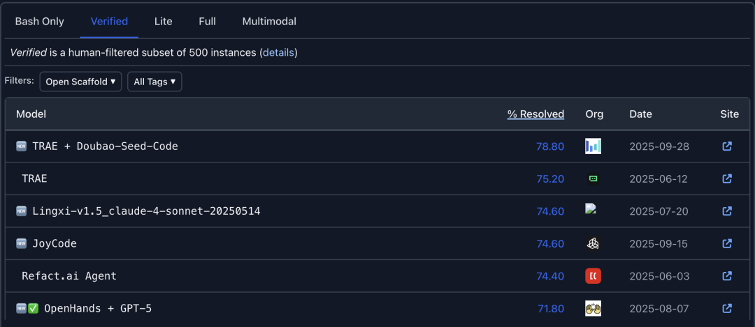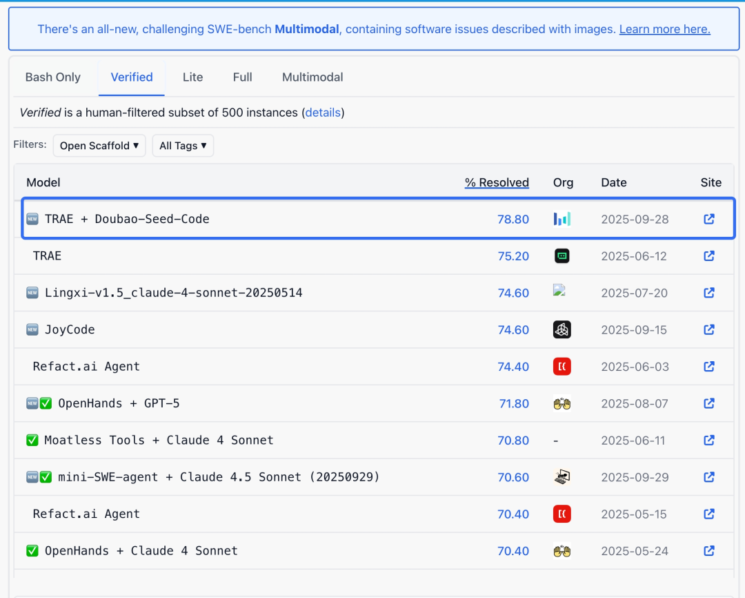 现下,Doubao-Seed-Code和TRAE的组合拳更是有亮眼表现,在SWE-Bench-Verified基准上“卷”到了SOTA。