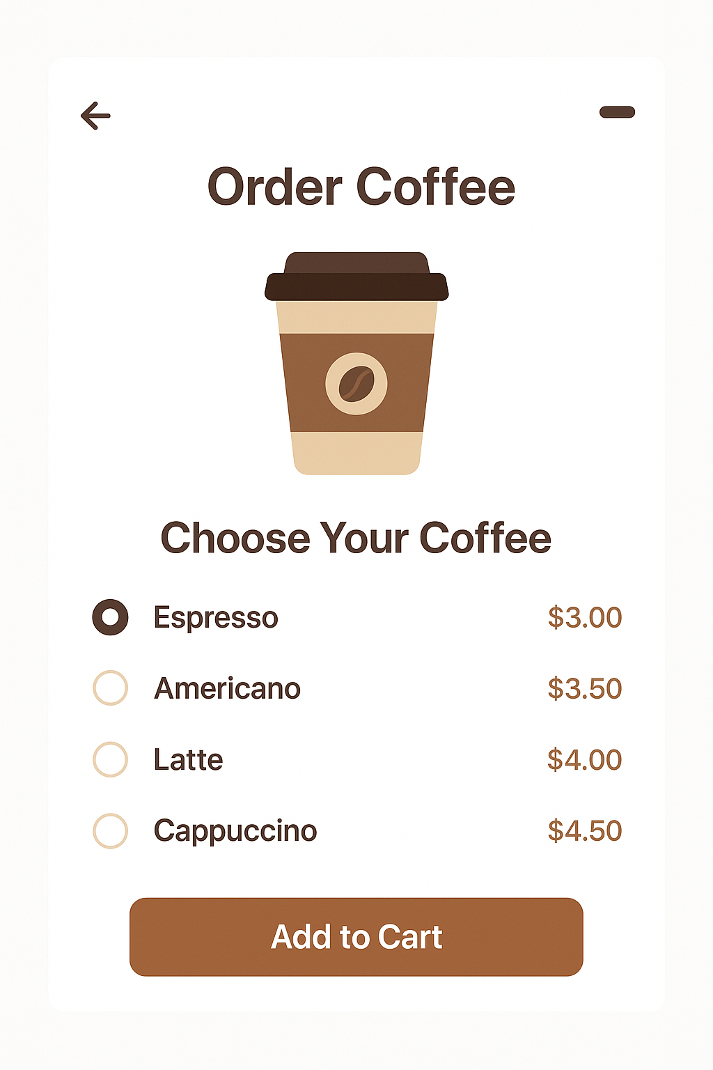 (提供UI设计稿)请参考给出的UI设计稿图片,生成一个“移动端咖啡点单页面”,生成满足所有要求的前端代码,确保页面主题明确。
